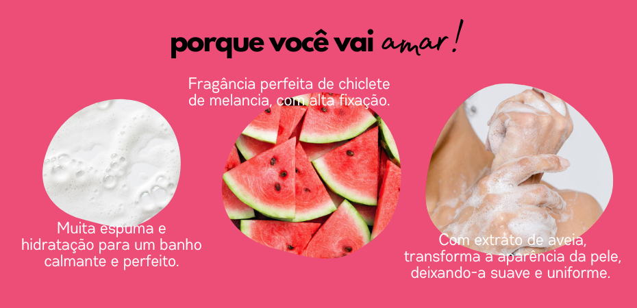 Fragância: Deliciosa fragância frutada de melancia! Esta fragância tem como principais acordes Ozônico, Aquático, Doce e Frutado, com as notas de topo Açúcar, Limão Gelado e Mandarina Verde, com as notas de coração Melancia, Lírio-do-Vale e Papoula, e com as notas de fundo Almíscar e Cedro.