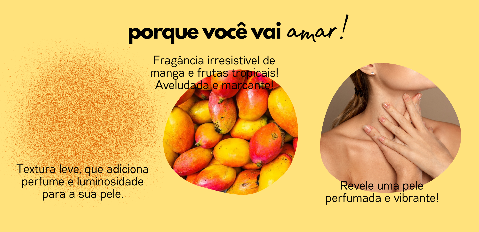Fragância: Deliciosa fragância tropical de manga doce! Esta fragância tem como principais acordes Tropical, Frutado e Doce, com as notas de topo Manga, Amora e Pimenta Preta, com as notas de coração Lótus, Jasmim e Raíz de Orris, e com as notas de fundo Baunilha, Glacé Rosa e Patchouli.